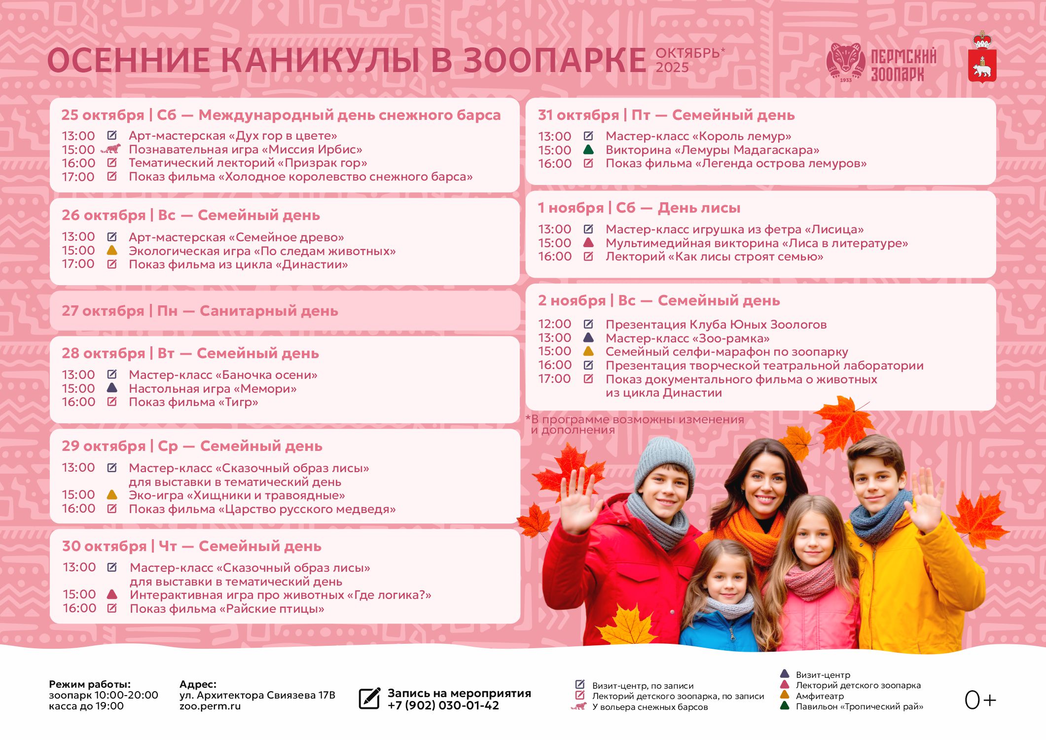 С 25 октября по 2 ноября (27 октября в зоопарке - санитарный день) для детей и взрослых запланированы мастер-классы, показы фильмов, квесты, игры, и тематические праздники.